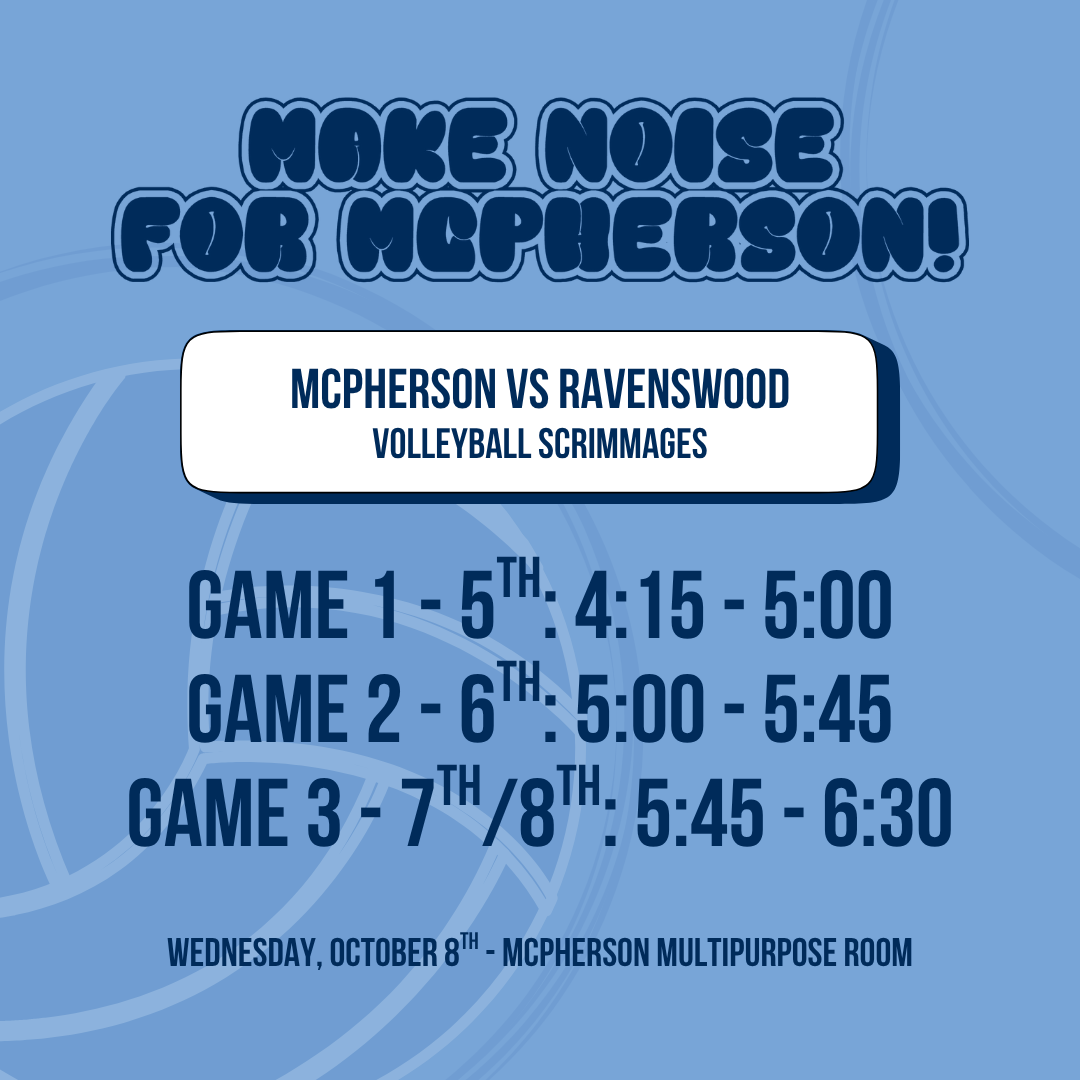 Come out and show your school spirit as our Mighty McPherson team takes on Ravenswood in an exciting volleyball showdown! Let’s pack the stands, cheer loud, and Make Noise for McPherson!