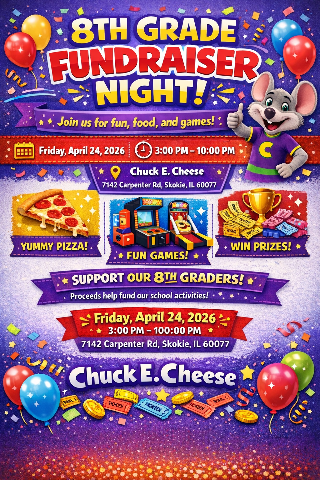 Help us make this year unforgettable for our students! We’re hosting a special fundraiser to support our 8th Graders, and we want to see you there for a night of food, games, and prizes.